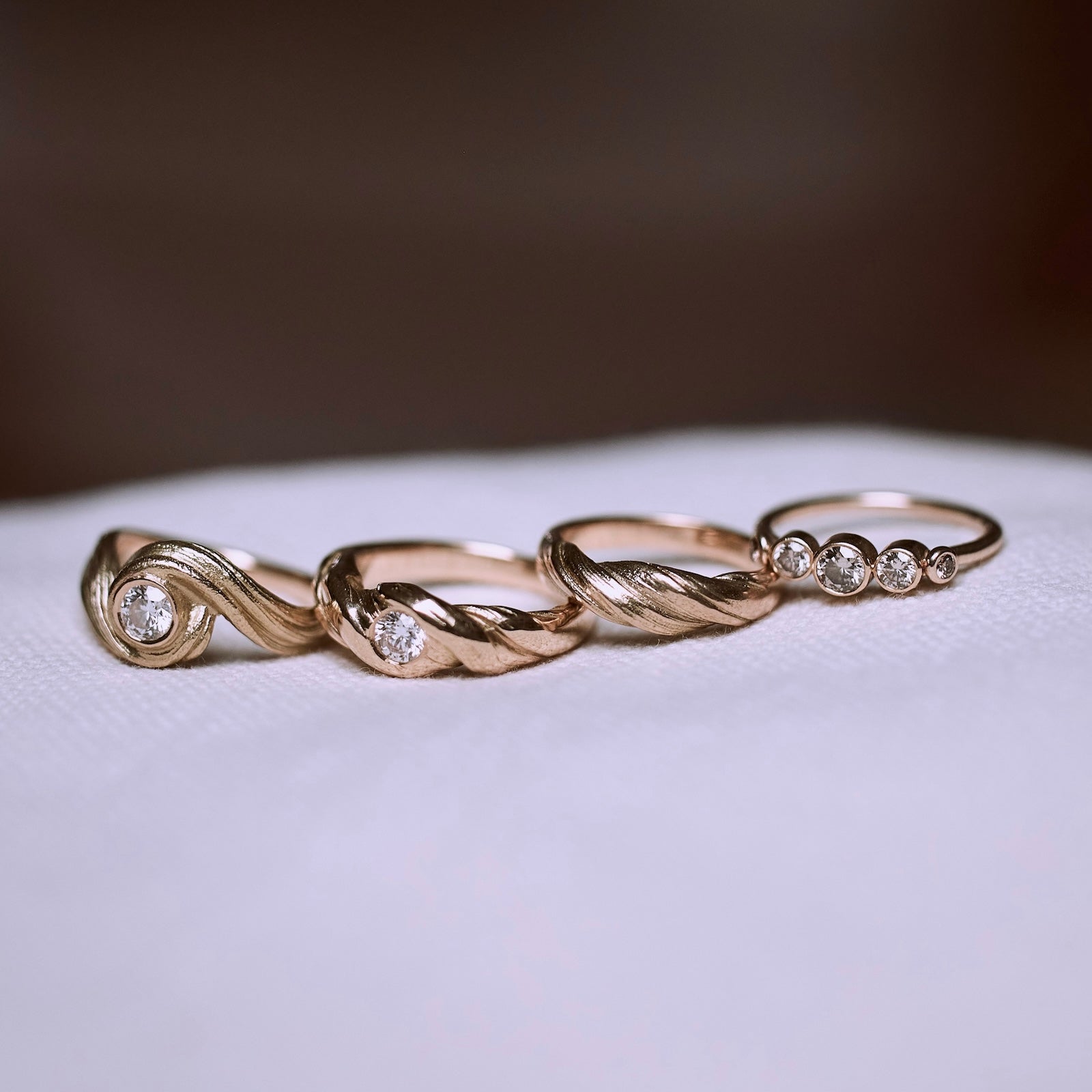 Organic and feminine diamond ring . Ocean Guld Ring is handmade in solid 14 carat gold and set with a light champagne colored ring 0.35 ct. diamond. The Ocean ring is inspired by the sea, the soft and light shapes of the waves, as well as the fascinating details from mussels and conch shells.